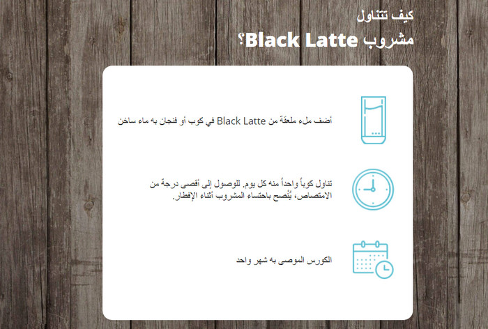 لتحضير مشروب، يجب إذابة ملعقتين صغيرتين من المركز في 200 مل من الماء. يوصى بشرب كوب واحد في اليوم Black Latte.